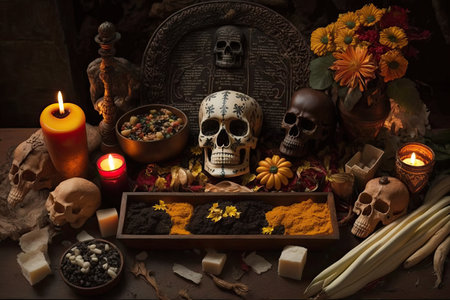day of the dead altar, filled with offerings to the deceased, created with generative ai