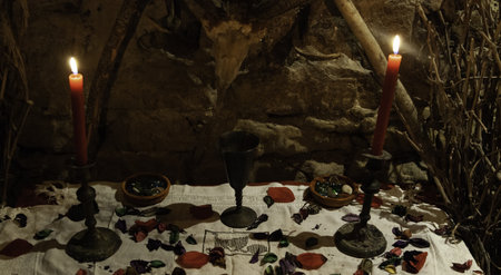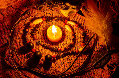 Vodun or voodoo ritual table with candles, puppet and a human skull, black magician and religion