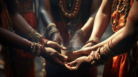 A close-up image capturing hands adorned with vibrant beads and intricate body art, reflecting deep cultural heritage and artistic expression.