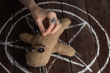 Voodoo doll on a wooden background with dramatic lighting. The concept of witchcraft and black art and the occult. Burlap doll on the background of a drawn star. Hand sticking pins into a doll. Copy space.