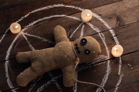 Voodoo doll on a wooden background with dramatic lighting and candles. The concept of witchcraft and black art and the occult. Burlap doll on the background of a drawn star.