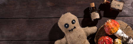 Voodoo doll on a wooden background with dramatic lighting. A sacking doll on a wooden background and bottles with a poisonous substance and amanita mushrooms. Pierce with a club.