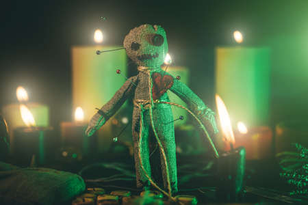 Voodoo Doll with green dramatic lighting in dark among candles.
