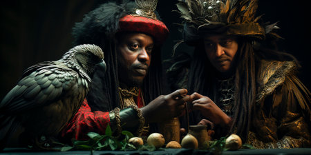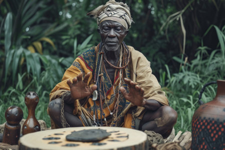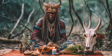 An African shaman using ancestral artifacts in a spiritual healing ceremony, reflecting deep-rooted tribal traditions.