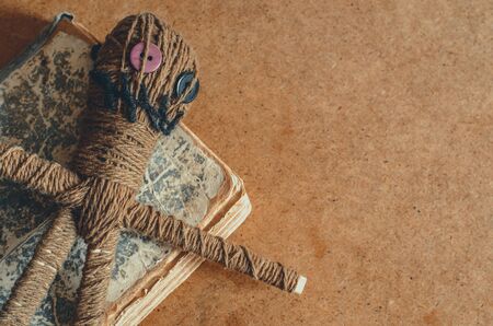 Voodoo doll with needles and old book on rough textured background. Copy space