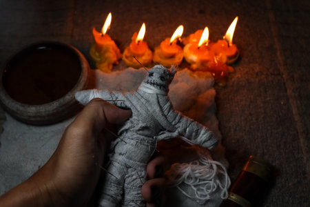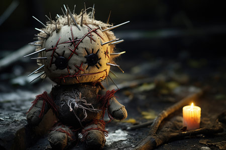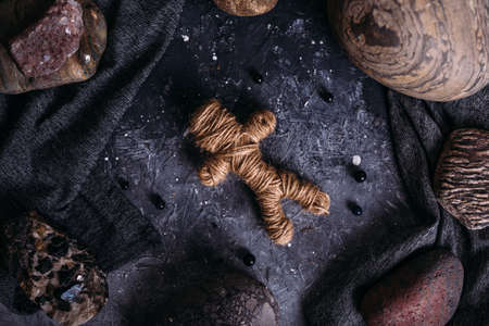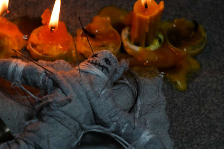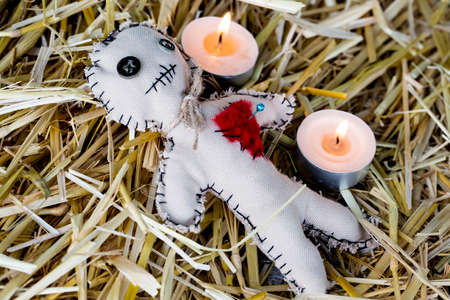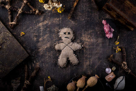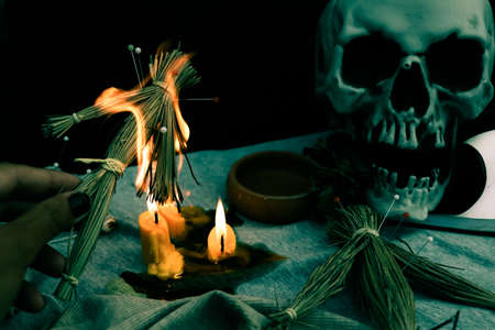 Voodoo doll. Black magic esoteric ritual. Halloween concept