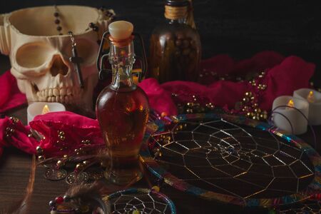 Scary still life with potions, skull, mortar, vintage bottles and candles on witch table. Halloween or esoteric concept. Black magic and occult objects in evil interior