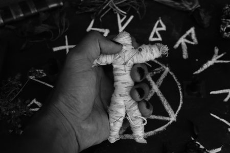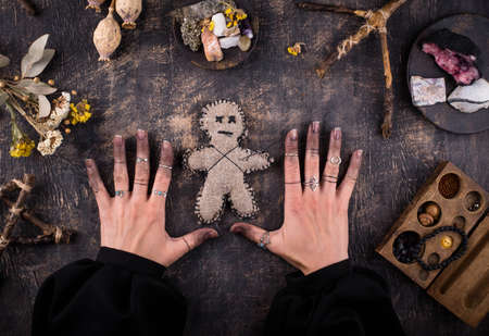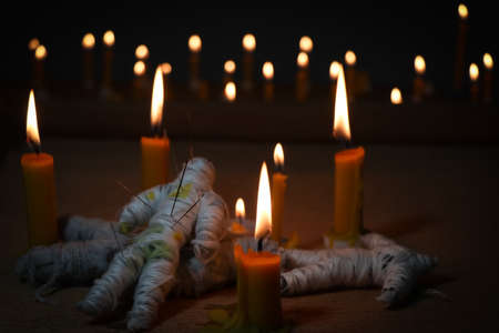 Voodoo doll. Black magic esoteric ritual. Halloween concept.