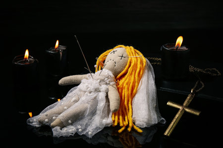 Voodoo doll pierced with pins, cross and candles on black table. Curse ceremony