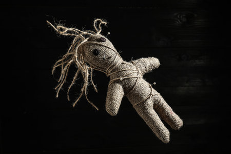 Female voodoo doll with pins surrounded by ceremonial items on black wooden background