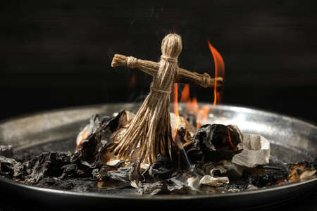 Voodoo doll burning in metal tray on dark background. Curse ceremony