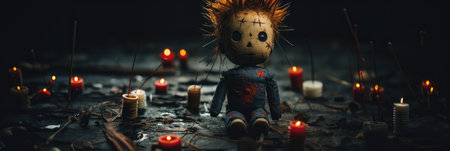 Voodoo doll pierced with pins surrounded by ceremonial items on table. Curse ceremony