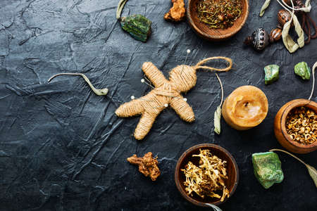 Voodoo doll, magical herbs and witchcraft attributes on an old table
