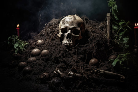 Grim graveyard scene with unearthed bones and eerie lighting Frozen artwork depicting a still life