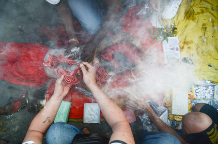 Close-up portrait of a man in a golden costume with a burning incense stick