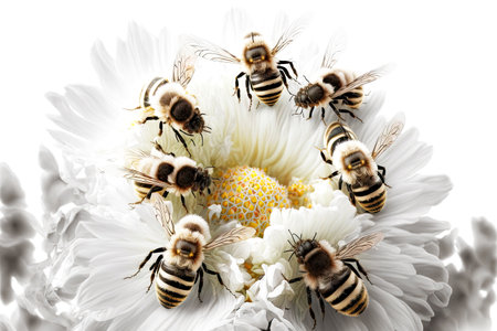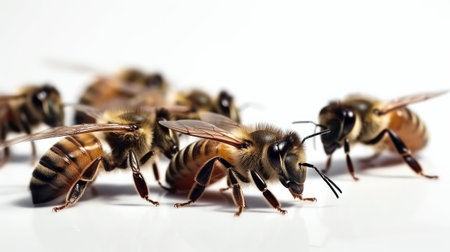 Bee macro isolated on a clean white background. Detailed bee. Concept of close up insect, entomology studies, and nature's intricacy. Banner. Copy space