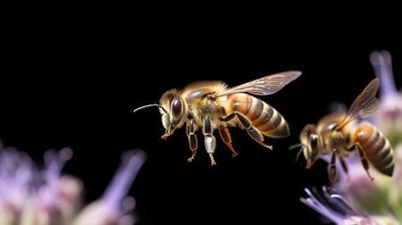 Close up of two flying bees. Beekeeping concept.