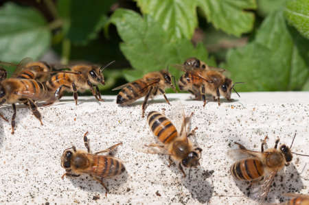Close-up working bees near the beehive on a bright spring day.