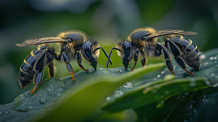 Close-up of a group of bees on a green leaf.