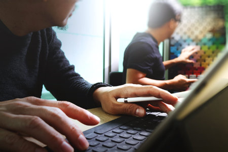 Coworking process, entrepreneur team working in creative office space. using digital tablet docking keybord and laptop with smartphone on marble desk,light beam effect