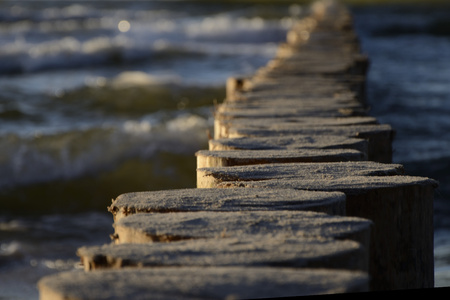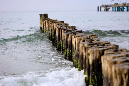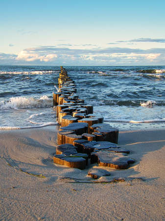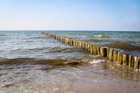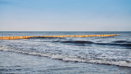 groynes on the beach of the Baltic Sea in Zingst. Waves break on the wood. they protect the coast of the German Baltic Sea from the waves. In addition, they are also beautiful to look at.