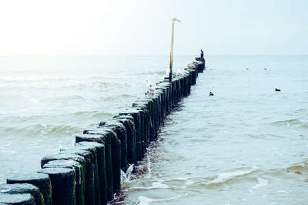 Breakwater on seashore from wooden logs. Seagulls are sitting on it in the middle of sea. Cloudy rainy weather.