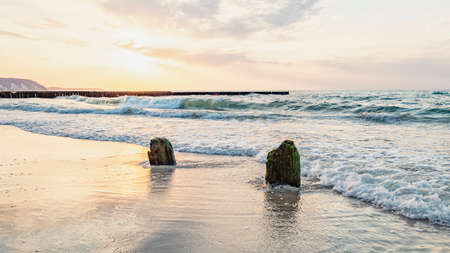 Baltic Sea in evening. Surf and soft waves, calmness and reclax. Beautiful nautical design, selective focus.