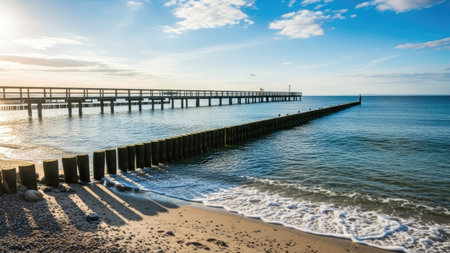 maritime background, wooden breakwater in calm baltic sea against blue sky