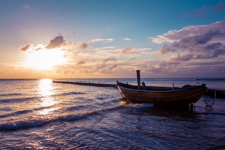 the Baltic Sea through the sea to the horizon at sunset. Romantic mood on vacation in Zingst