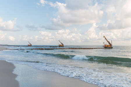 Putting up piles on the Baltic sea. Breakwaters in Poland on Hel peninsula.