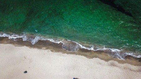 Seashore photographed from the drone. The ebb and flow of the sea. Desert beaches. More green and blue colors