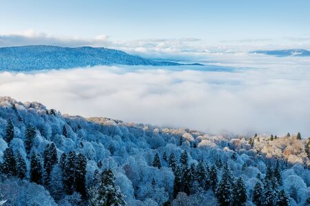View from the top of the snow-covered forest with low-floating clouds. Beautiful winter landscape. Adygea, Krasnodar region