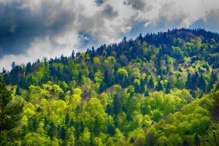dramatic forest landscape. Hill covered with green trees with strong clouds in the sky.
