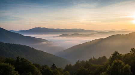 view of rolling hills and a forest covered in mist, capturing the peaceful beauty of a morning in nature.