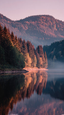A tranquil lake reflects sunrise hues on a forested shore and distant, hazy mountain