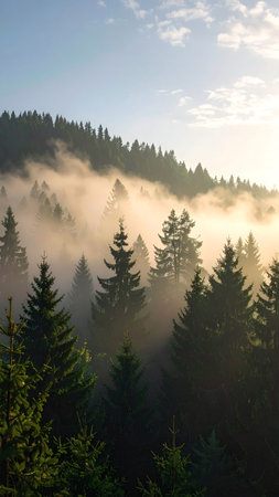 Landscape photo of fir misty forest with fog. Natural aesthetic view for environmental consciousness.