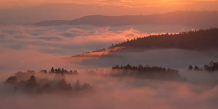 panorama of amazing foggy sunrise over mountains