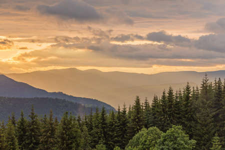 Evening sky above the dark mountain ranges. Carpathians mountains at summer, west Ukraine. Nature background. Dark peaks covered with evening fog. Hillsides with dense forest. Blurred background