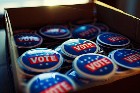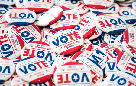 A close-up of numerous Vote buttons promoting the United States of America presidential election, emphasizing civic duty and participation in 3D rendering