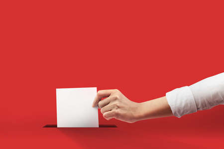 Hand of a voter putting vote in the ballot box. Election concept.