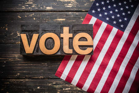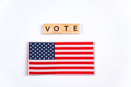 American flag as backdrop for the word VOTE, voting process. Presidential election campaign
