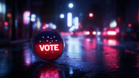 Glowing Vote button on wet city street at night, symbolizing civic duty and democracy