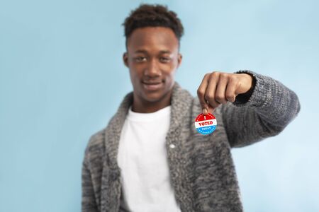 closeup of a young caucasian man with a vote badge for the United States election in his hand, on an off-white background