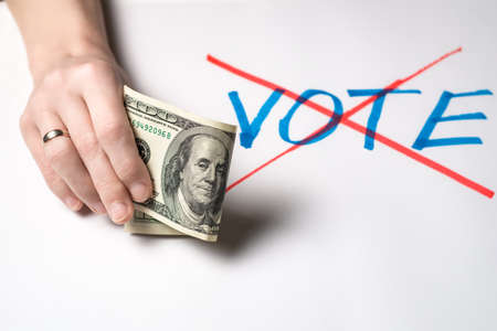 Buying votes of voters concept. A woman's hand holds one hundred US dollars against the background of the crossed out word vote.