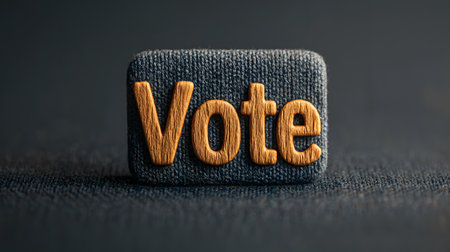 A close-up of a textured fabric with the word 'Vote' embroidered prominently in gold. Background appears solid.