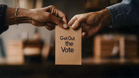 Two hands exchange a 'Get Out the Vote' flyer, emphasizing civic duty. The blurred background hints at a vibrant community scene.