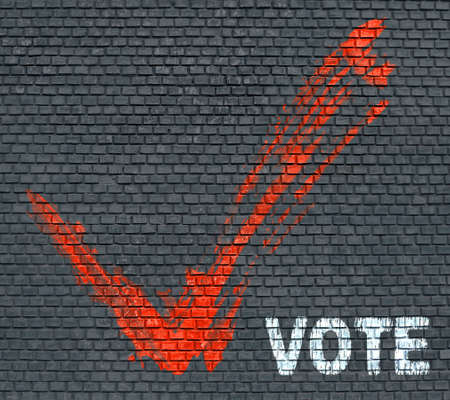 Red painted tick and word Vote on blue brick wall background