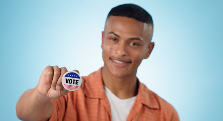 Man, vote sticker and smile for election, positive and politics for america, government and blue studio background. Badge, voter choice and support for party, registration or hand for voting register