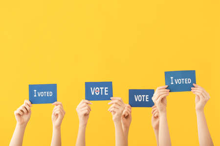 Hands of voting people with paper sheets on color background