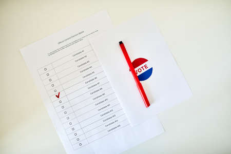 Top view closeup of voting ballot with marked box and red pen on white table, copy space